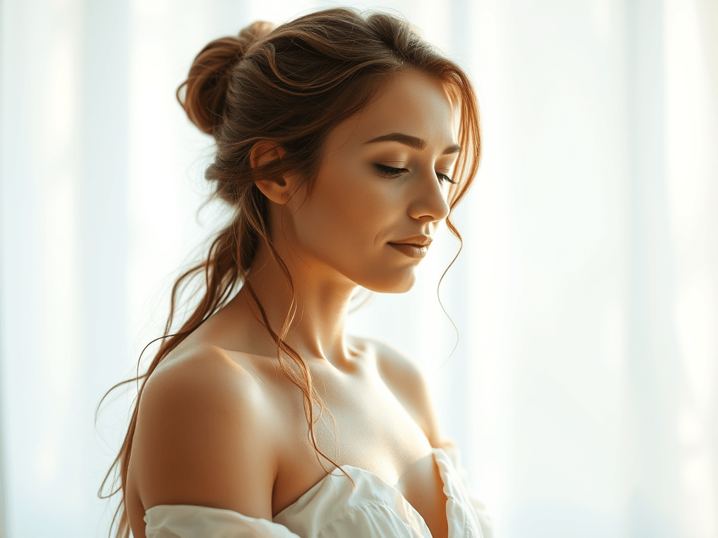 Portrait d’une femme contemplative, mise en lumière douce, évoquant des thèmes de spiritualité et d’intuition.